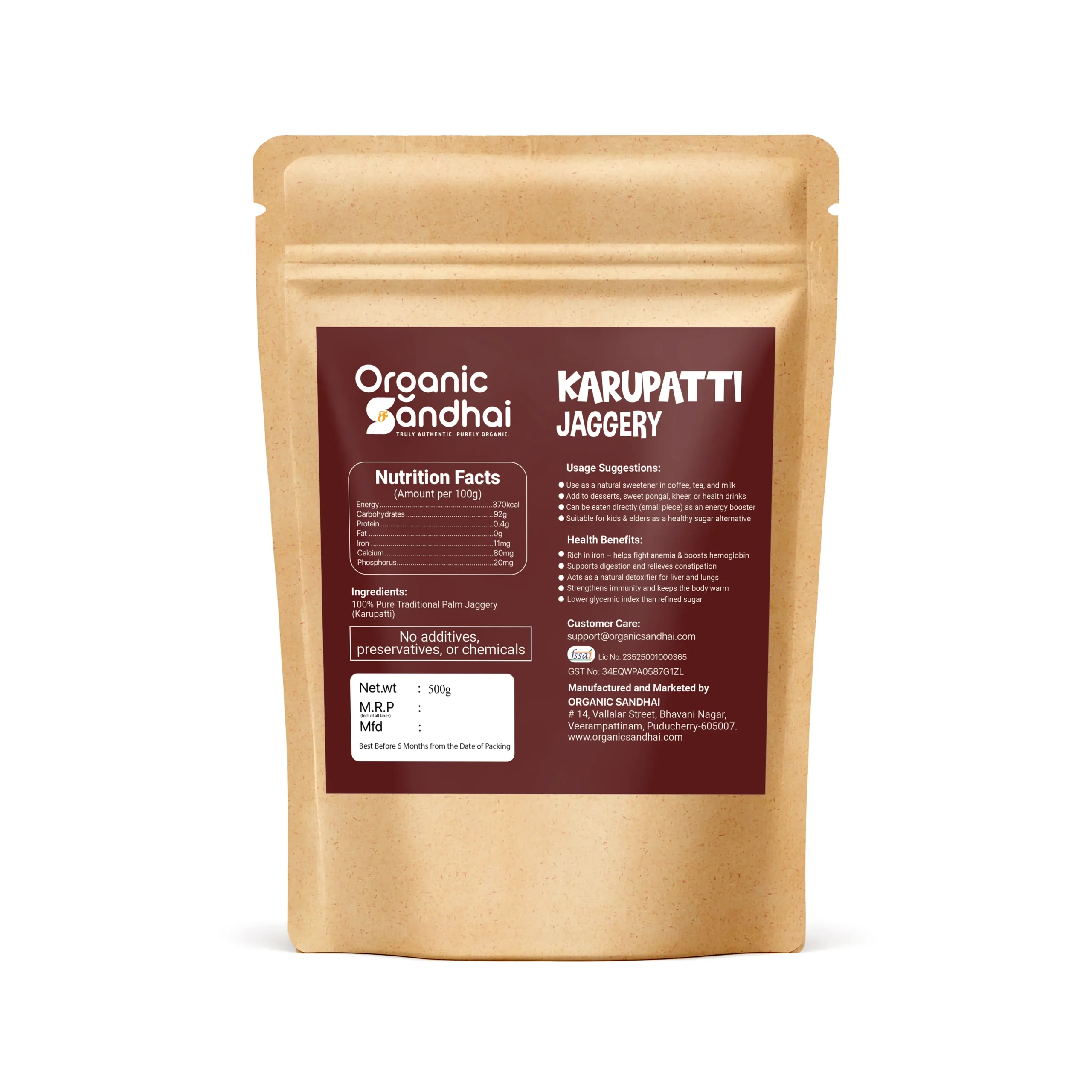 Sourced from traditional palm trees and made using age-old methods, Organic Sandhaiโs Karupatti Jaggery is a natural sweetener packed with iron, magnesium, and essential minerals. Unlike refined sugar, karupatti is chemical-free, unrefined, and supports digestion, immunity, and energy levels.
